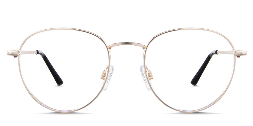 Allison eyeglasses in the mimosa variant - have a gold temple arm and black temple tips.