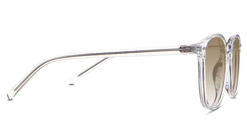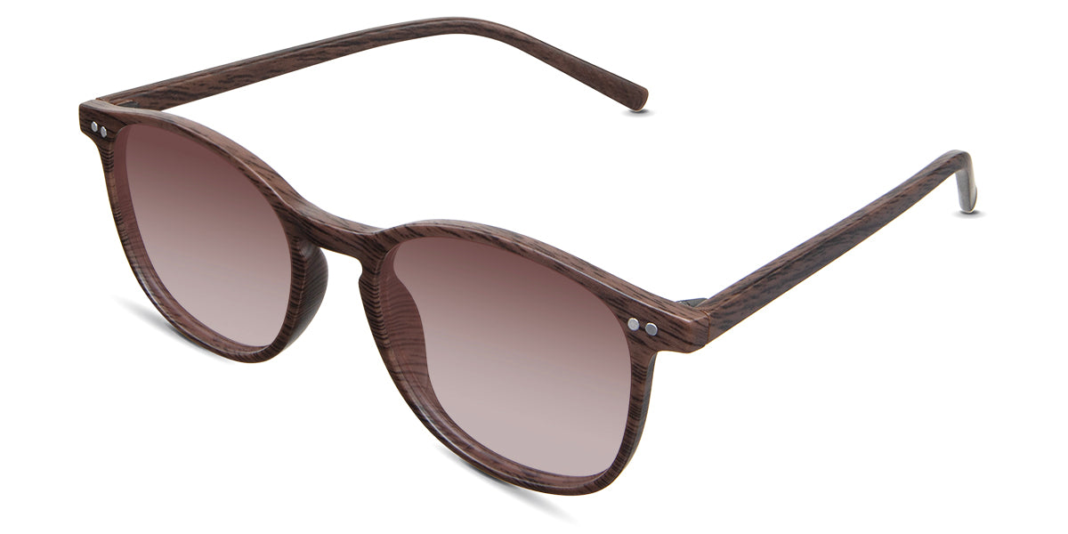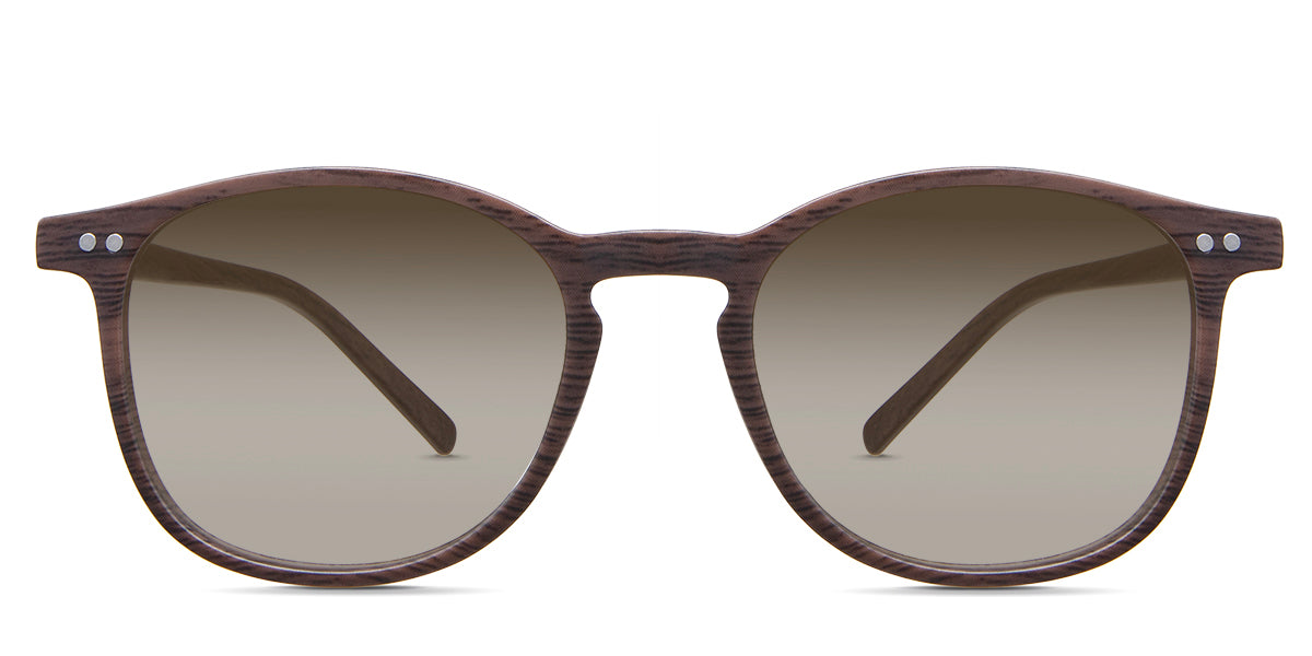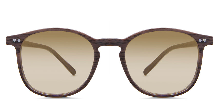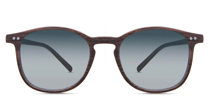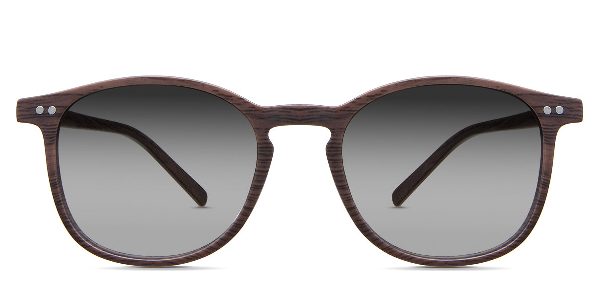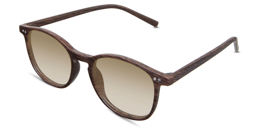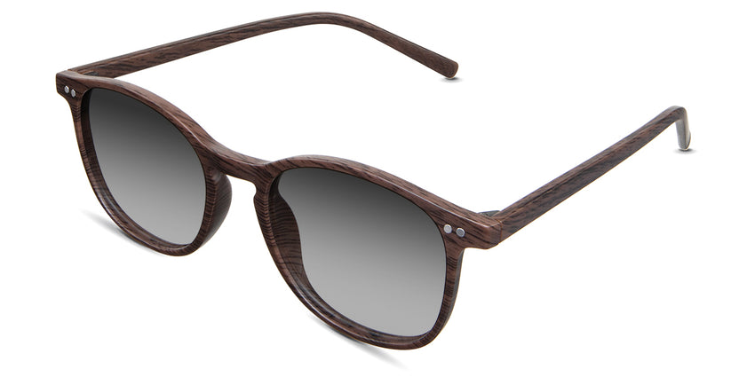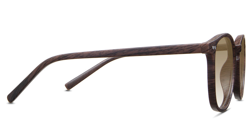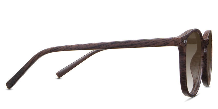 Coven black tinted Gradient sunglasses in the sealywood variant - it's a thin round frame with a wide nose bridge and a slim temple arm that is 140mm long.