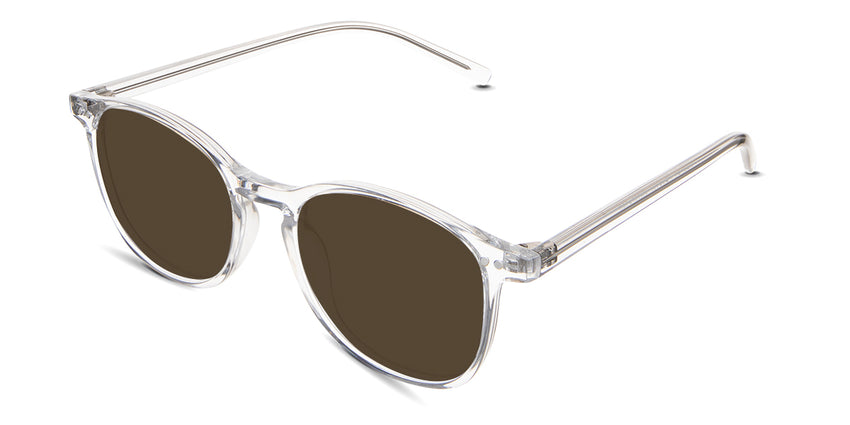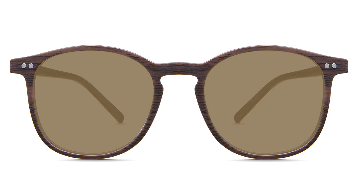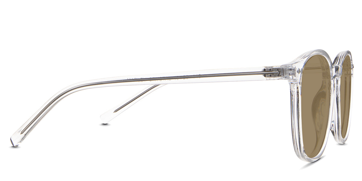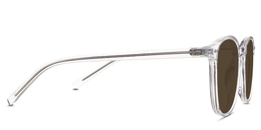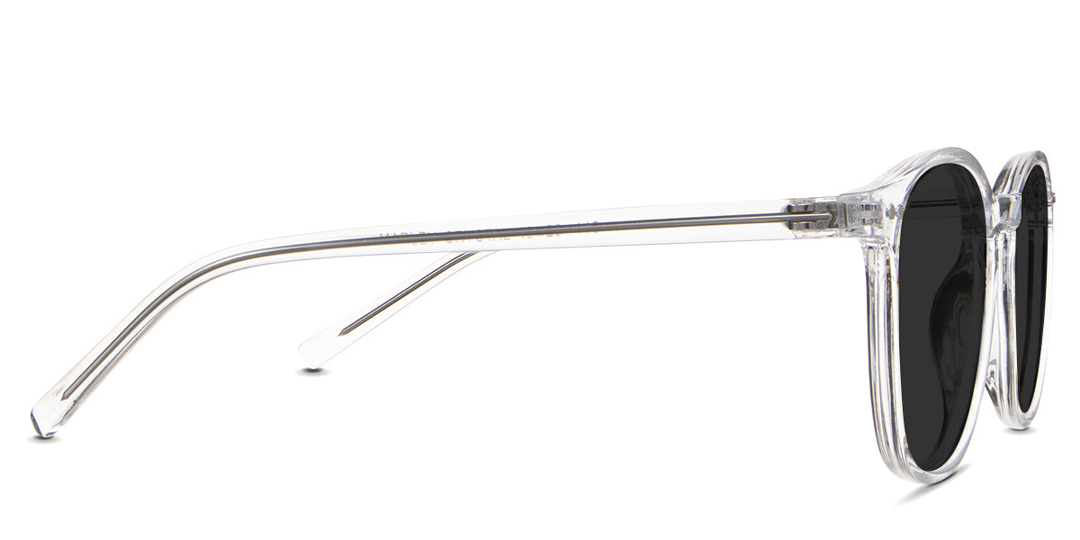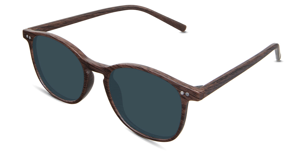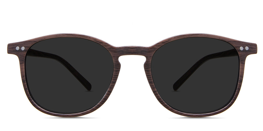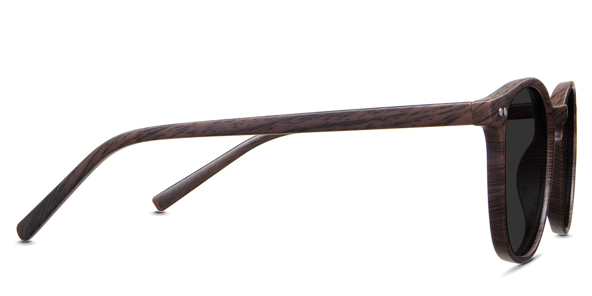 Coven black tinted Standard Solid sunglasses in the sealywood variant - it's a thin round frame with a wide nose bridge and a slim temple arm that is 140mm long.