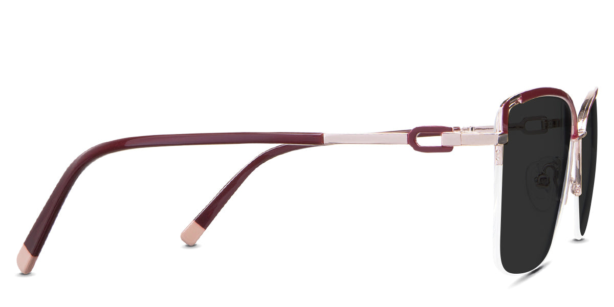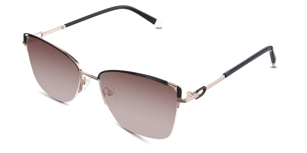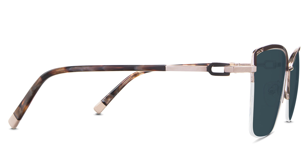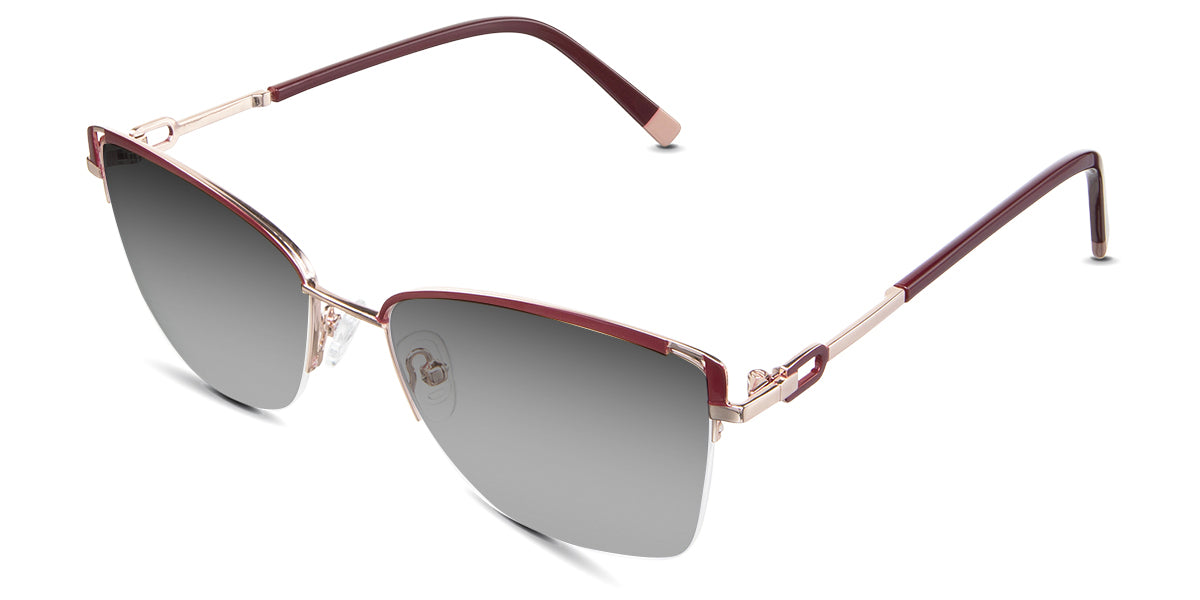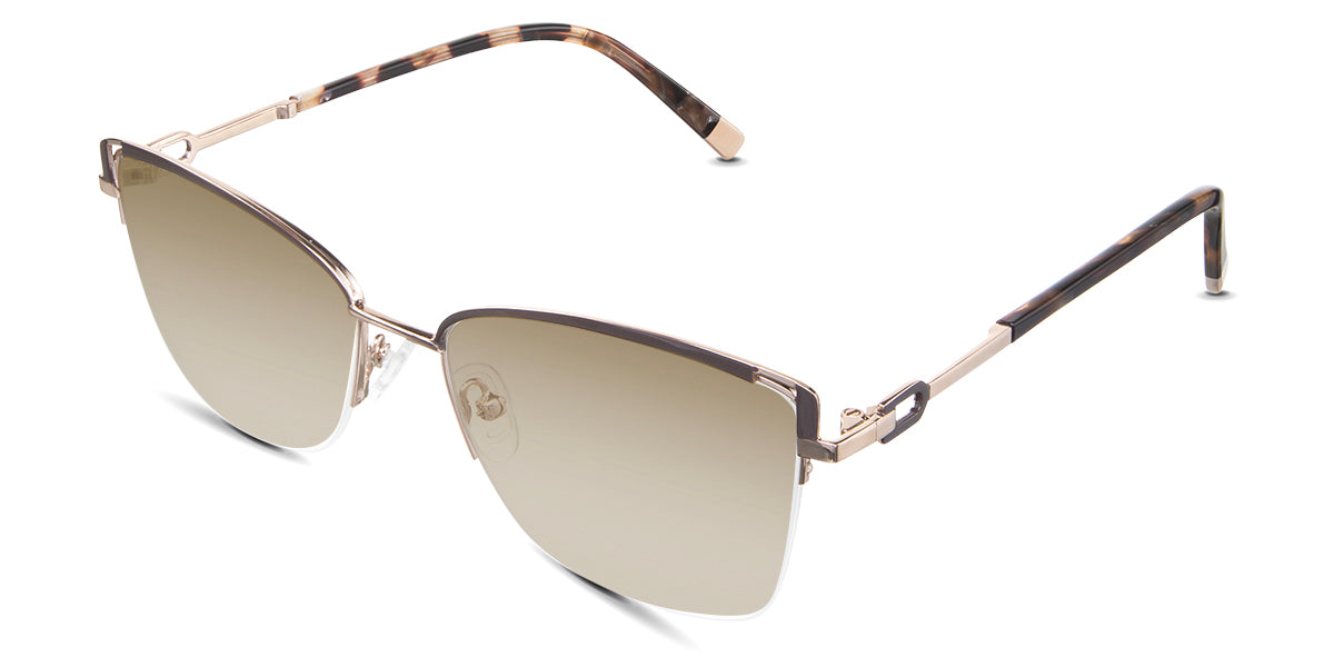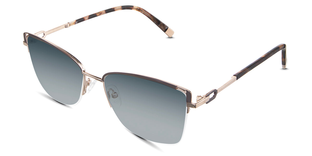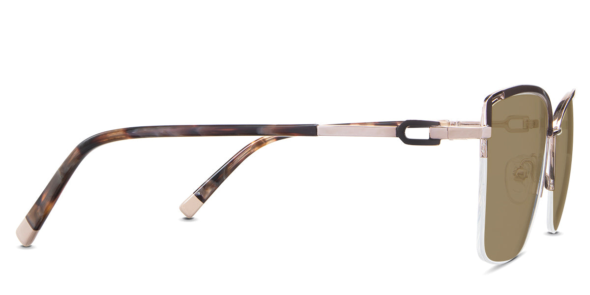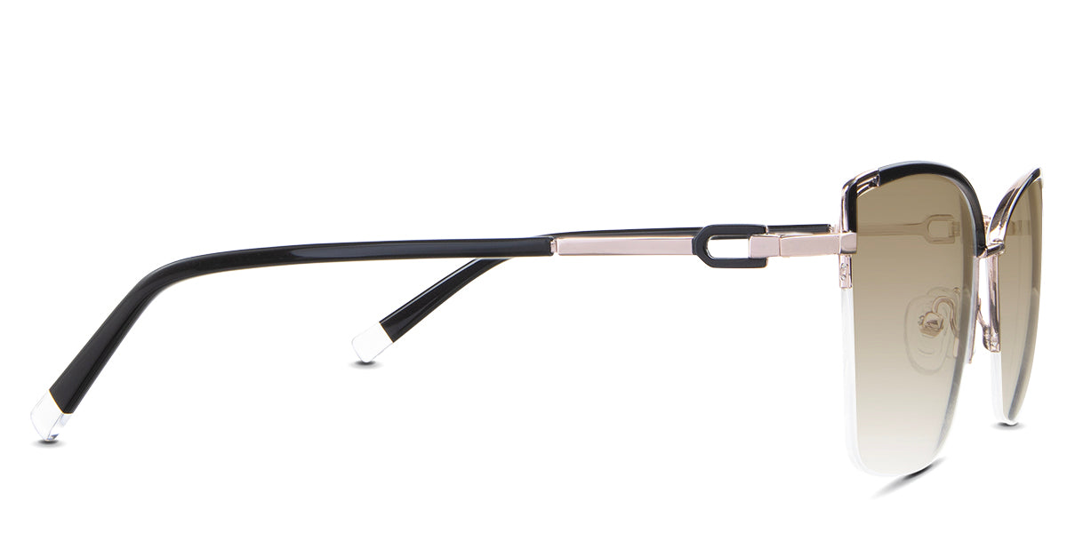 Designed for those who seek a delicate yet distinctive aesthetic, Phoebe checks all the boxes. Its square corners are gently rounded, softening the frame, while an elegant lift at the temples adds a touch of femininity and understated chic. A metal brow bar echoes the shape of the lenses, all complemented by a rimless lower half for a harmonious finish.