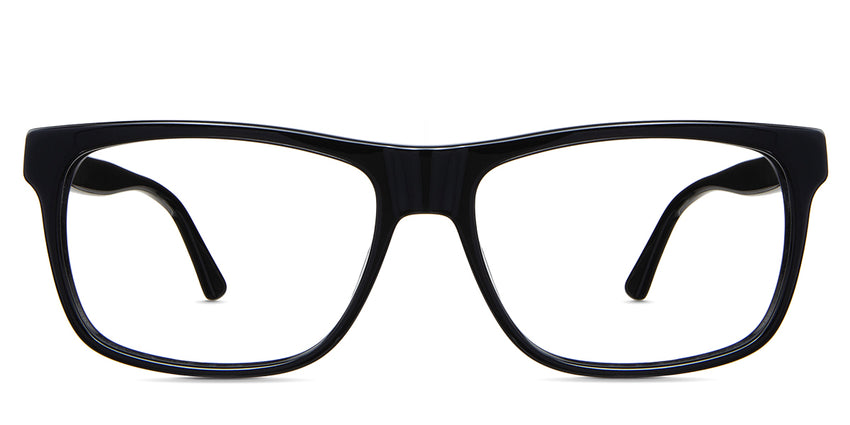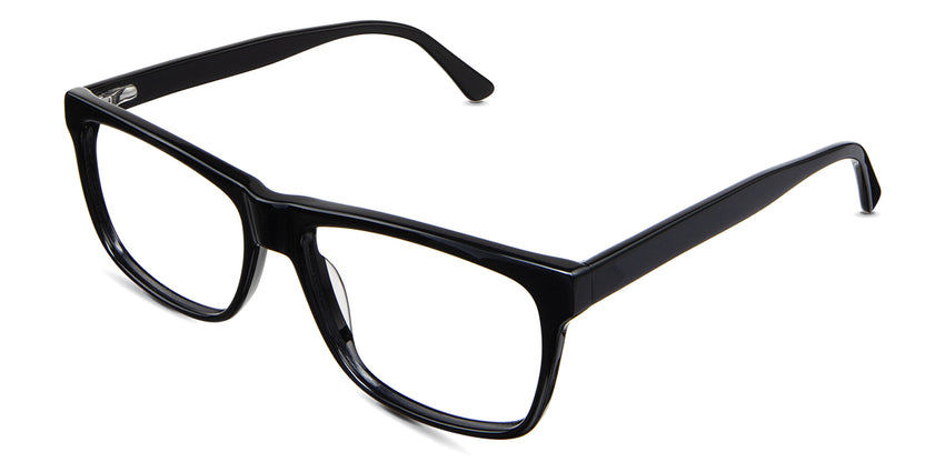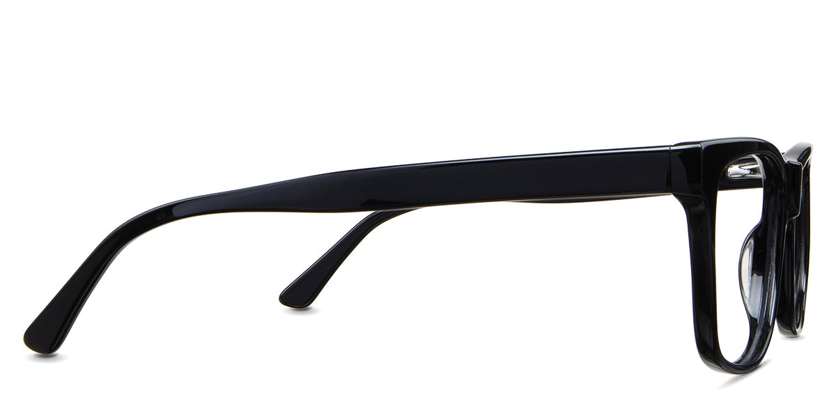 Wallis Eyeglasses in the midnight variant - it's a medium to wide frame with a broad temple arm.
